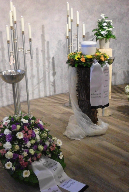 Unsere Floristen sorgen für die geschmackvolle Umsetzung Ihrer Trauerfloristik – ob Sargdekoration, Urnenkranz oder -gesteck. Mit einer bedruckten Kranzschleife erhalten Trauergestecke eine besonders persönliche Note.